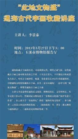 (记者 攸莉)5月27日下午3:00,“此地文物盛”——通海古代字画收藏讲座将在市博物馆报告厅开讲,通海县地方文化人士李景泰将从通海古字画收藏等方面与广大市民、藏友交流、切磋。
