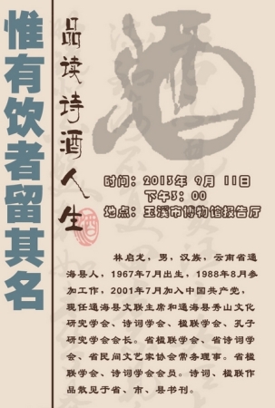 本网讯 9月11日,我馆玉博讲堂将举办地方文化系列讲座之《惟有饮者留其名——品读诗酒人生》。邀请现任通海县文联主席林启龙先生为观众主讲。