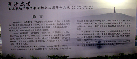 2014年7月6日上午,红塔集团玉溪卷烟厂职工书画协会成立三周年书画作品展在玉溪市博物馆开展,本次展出书画作品100余件,都来自玉溪卷烟厂一线职工,形式、内容多样,展示了玉溪卷烟厂职工丰富的业余文化生活。(图/文 王溢)