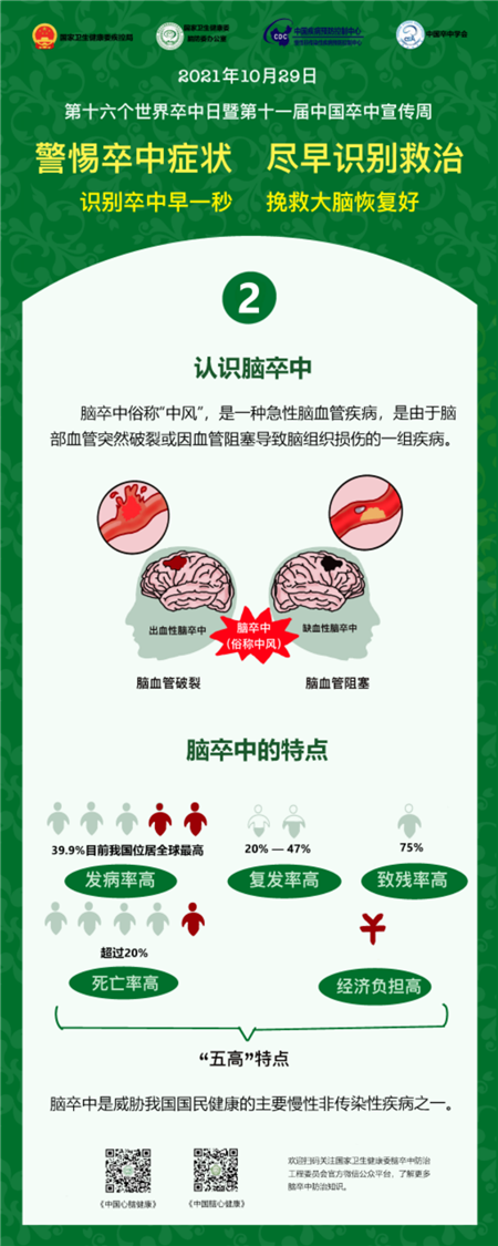 2021年10月29日是第十六个“世界卒中日”活动主题:警惕卒中症状,尽早识别救治。宣传口号:识别卒中早一秒,挽救大脑恢复好,脑卒中(脑中风)是一种急性脑血管疾病,是由于血管阻塞导致血液不能流入大脑或脑部血管突然破裂而引起脑组织损伤的一组疾病,包括缺血性卒中和出血性卒中。脑卒中是由生活方式、环境、遗传等多种因素共同导致的疾病。科学研究和大量实践证明,脑卒中可防可治。早期积极控制脑卒中危险因素,规范化开展脑卒中诊疗,可有效降低脑血管病的发病率、复发率、致残率及死亡率。