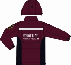 采用绣红色(哈佛红)和藏青色搭配,左胸口和后背印有中国卫生标识。