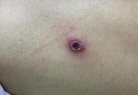 细心的王聪医生给周先生查体后,发现其左侧腰部有一大小约0.2x0.3cm的椭圆形焦痂,并触及双侧腹股沟淋巴结肿大,进一步完善相关检查,发现周先生合并肺部感染、胸腔积液、肝功能受损、血小板减少、低蛋白血症、电解质紊乱、凝血功能异常等多器官功能障碍,结合患者病史、体征、流行病学资料及相关检查后,明确诊断为“恙虫病”。经积极治疗一周后,周先生病情明显好转而出院。