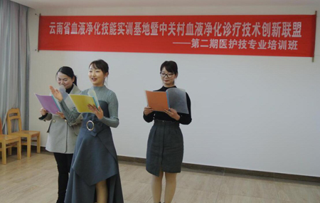 会上,参会领导发表了重要讲话,对满载而归的学员表示祝贺,对辛勤付出的老师表示感谢,并希望学员们将所学到的知识应用到临床工作中,为血液净化人才队伍注入富有青春气息的新鲜血液,为血液净化事业的发展奉献自己的力量。学员代表郭俊涛、曾志红、纳倩汇报了学习的体会和收获,会上还对成绩优异的优秀毕业生进行了表彰,最后老师和学员们通过自编自演的歌曲、诗朗诵等形式进行了汇报表演。