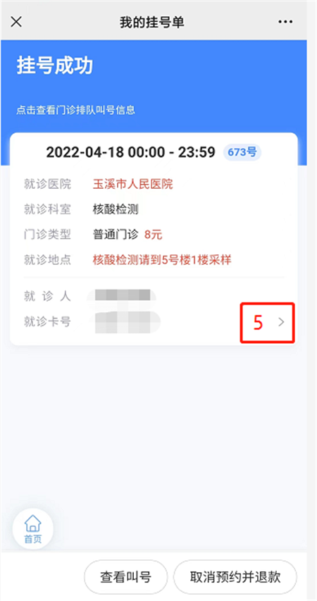 四、选择就诊人→根据提示完成缴费→挂号成功界面点击就诊卡号