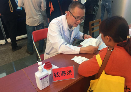 为了积极响应中国抗癌协会的号召,帮助市民科学认识癌症,推进癌症防控宣传,推广无痛生活理念,我院肿瘤科副主任医师钱海洪、马玉荣、王华、主任护师速凤媛等组成的专家团队于4月18日上午在门诊楼一楼大厅举行肿瘤防治义诊活动。