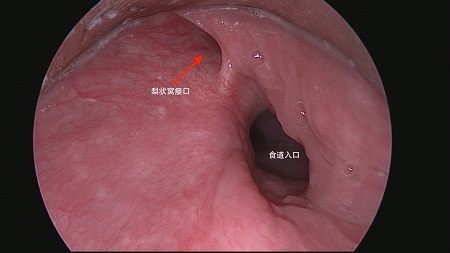 支撑喉镜下看到食道入口旁的梨状窝瘘口