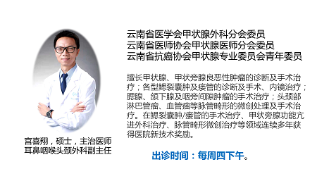 主持该病例治疗的是玉溪市人民医院耳鼻喉科副主任宫喜翔,长期以来一直致力于梨状窝瘘解剖和手术的临床研究,目前已在《中华耳鼻咽喉头颈外科杂志》、《临床耳鼻咽喉头颈外科杂志》等国家级刊物上发表梨状窝瘘相关的病原学、解剖学、手术学论文多篇,其研究成果先后多次在中华医学会耳鼻咽喉分会全国咽喉年会、中华医学会全国小儿外科年会等国家级会议上进行发言交流。由于对梨状窝瘘的解剖和手术有较为深刻的认识和见解,参编《儿童先天性梨状窝瘘诊断与治疗临床实践指南》,该指南已于2020年12月发布,是目前国内第一个梨状窝瘘的诊疗指南。
