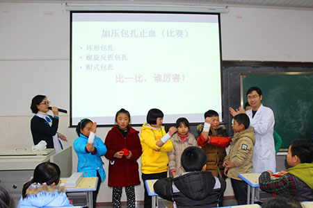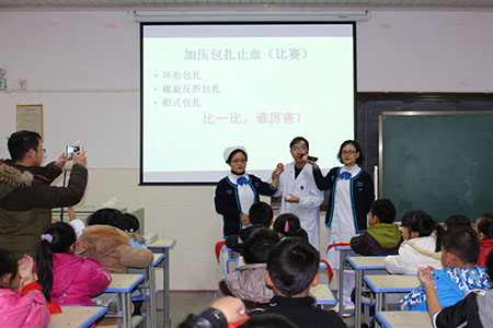 聂耳小学的孩子们今天可开心了——一场以“儿童意外伤害预防和急救”为主要内容的精彩培训在玉溪聂耳小学展开,给孩子们讲课的是来自玉溪市人民医院骨外三科的医护人员。 45分钟的急救知识小课堂气氛热烈,市医院的医护叔叔阿姨们将深奥的医学知识转换为孩子们喜爱的卡通图片和朗朗上口的儿歌,并通过现场情景模拟,孩子们边听边学边动手,用游戏的方式将常用的急救技能轻松掌握,在课堂上就熟练学会有效压迫止血、包扎固定、海姆立克急救法等技能,让孩子们一个个都当起了小医生,相互搞起了现场情景演练。 课堂上,医护叔叔阿姨们还通过将临床接诊时遇到的真实事例,把跌伤/坠楼、交通意外、烧伤/烫伤、窒息、触电、溺水等常见意外伤害的预防及如何有效自我急救融入讲解,以小故事中的形式有效吸引了孩子们的注意力。孩子们在听完讲解后,纷纷积极回答问题,竞相上台进行技能比拼。 据悉,意外伤害是0-14岁儿童健康的头号“杀手”,有调查显示61.2%的意外伤害发生在家中。每到假期,医院外科就会迎来很多小患者,他们中大部分意外伤害是可以避免的,由于孩子缺乏安全意识,家长疏于防范或是意外发生后处理不但反而给孩子带来二次伤害。市医院此次主动联系学校,将“儿童意外伤害预防和急救”小课堂开进校园不仅是承担社会公众卫生责任的体现,也是医院联动社区开展服务的一种创新;不但获得了师生们的热烈欢迎,也赢得了学生家长微信群里的一致点赞。(骨外三科李红英) |