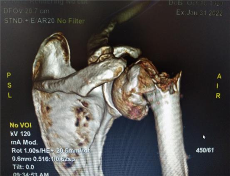 骨外三科接诊后,门诊摄片显示李大爷的右肱骨外科颈粉碎性骨折,需要手术治疗。