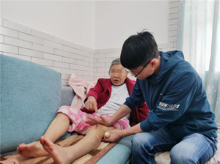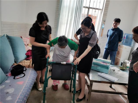 从丁阿姨家出,医护人员又来到了因髌骨骨折术后出院6天的金阿姨家里。出院时,金阿姨术后膝关节还稍肿胀,伤口缝线还未拆。在陈医生检查后说“金阿姨,恢复的不错啊!可有一点,膝关节活动度还不够呢,要多花些心思了!”,金阿姨听后不好意思地笑笑,并连连点头。陈家星医生又为金阿姨擦拭着消肿气雾剂,交代注意事项;责任护士也耐心地指导金阿姨如何安全正确使用助行器,恢复自理能力;护士长对家属开展宣教和康复指导。经过专业指导和鼓励,金阿姨恢复健康的信心倍增,表示将积极进行康复训练。