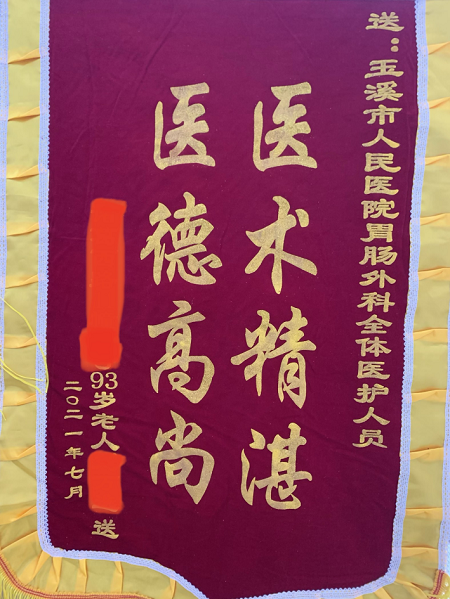 拟定了治疗方案后,患者先行深静脉置管后静脉肠外营养+口服营养液改善营养,间断输血纠正贫血,待营养状况改善、相关检查完善后,经过周密术前准备,在我院胃肠外科、麻醉科、手术室及重症医学科医护人员的齐心协力下,胃肠外科团队对患者成功实施了胃癌切除手术。术后刘大爷恢复情况良好,不久就撤掉了心电监护仪,并可下床走动。刘大爷一家十分感激,为我院胃肠外科赠送了印有“医术精湛、医德高尚”的锦旗。