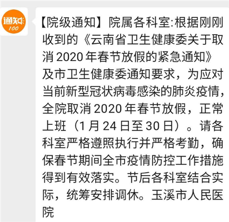 1月23日晚,玉溪市卫生健康委员会转发云南省卫生健康委员会办公室发布紧急通知,为应对当前新型新型冠状病毒感染的肺炎疫情,全省卫生健康系统取消2020年春节放假。我院积极响应,第一时间对全院各科室发出通知,取消2020年春节放假,正常上班,做好疫情的防预工作,确保人民群众度过一个安定欢乐祥和的新春佳节。