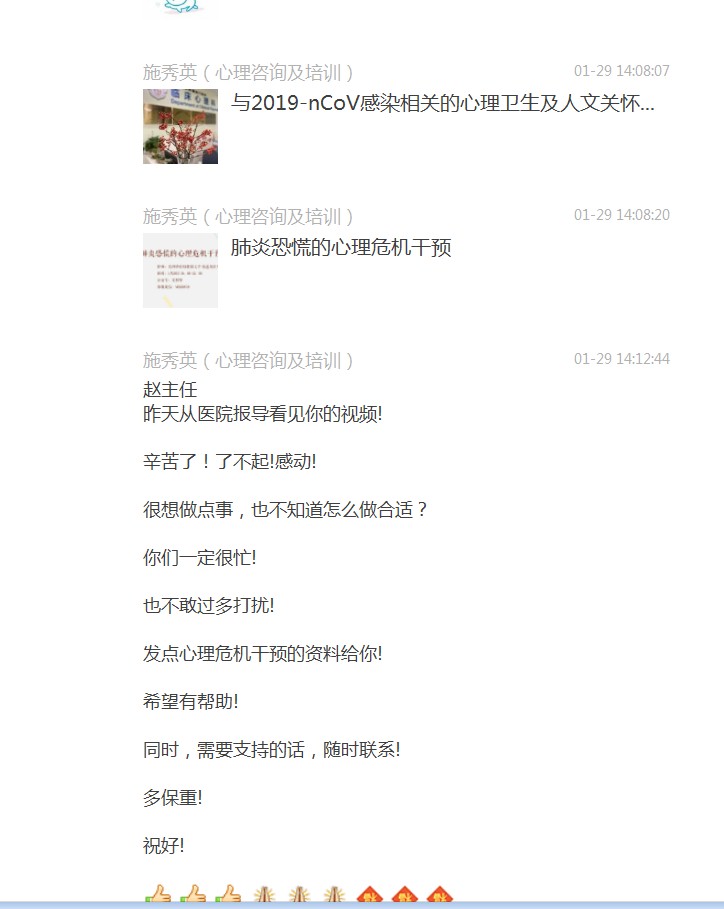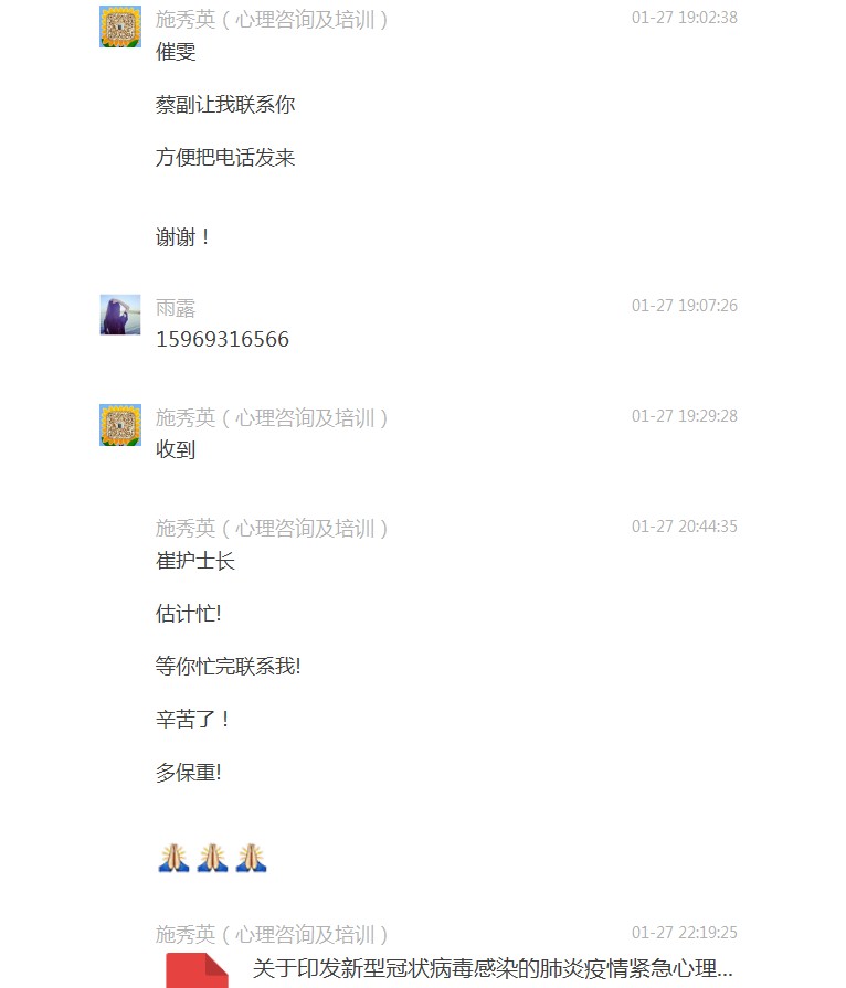 曾勇院长和杨玲副书记及时连线隔离病区医护人员,了解她们的状况给予慰问和安抚;护理部李长琼主任在微信群里经常对医护人员问候呵护,对他们存在的困难给予及时解决;临床心理科护士长施秀英经常连线隔离病区医护人员,了解她们及患者的心理状况,及时发布一些面对疫情的恐惧如何进行心理干预和调试方面的科普文章以及舒缓压力的音乐等给隔离区医护人员,并表示如果出现心理方面大的疾病,将及时进行评估和治疗;护士伏星是心理护理小组的成员,针对第一例确诊患者焦虑和自责的心理问题及时给予疏导,目前该患者心理情绪控制很好;隔离病区的医护人员焦虑和恐慌的心理问题也得到极大缓解。