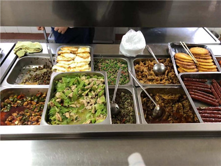 食堂负责人殷志介绍,新型冠状病毒疫情蔓延,医院的医务人员放弃假期,奋斗在一线,后勤人员虽不能上战场,但是做好饮食保障工作,为临床一线的医护人员和在院患者提供安全的餐饮,让医护人员吃口热菜、喝口热汤,就是向全院医护人员致敬。 为切实做好抗疫战争中的饮食保障工作,食堂组织员工开展新型冠状病毒肺炎相关知识的培训,要求他们在加工食品的过程中要全程佩戴口罩和一次性手套,每餐间隙都要对台面、栏杆、底板进行防护消毒,做好每餐的留样检测和餐厨废弃物回收处理工作。 在各种食材大幅涨价的情况下,食堂依旧保持原来定价,青笋炒肉、豌豆肉末、煎荷包蛋、泡椒鱿鱼……,各类菜品一应俱全。