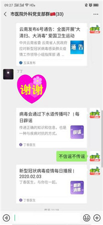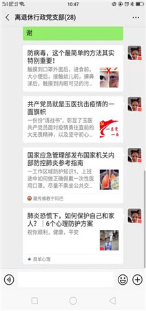 一是强化宣传,做好防疫宣传发动。指导员采取多渠道、多形式开展疫情防控宣传工作,通过支部微信群发布、电话指导等方式向离退休老同志及时传达中央和省、市委的最新防疫精神,大力普及疫情防控知识,及时准确发布疫情信息、医院战疫动态等。截止2月5日,发布疫情防控信息46条、疫情确诊新增情况信息4条、医院抗疫优秀事迹12条、防疫物品规范使用建议4条、辟谣信息1条,张贴宣传画12份。有效增强了离退休老同志防护知识和防控能力。