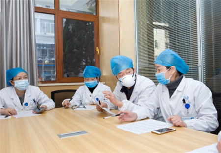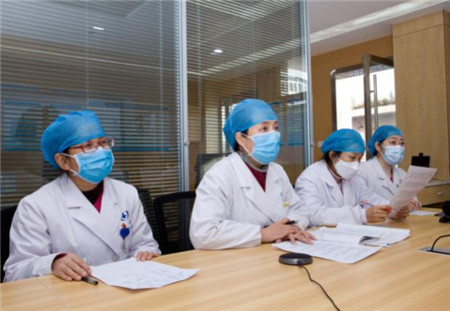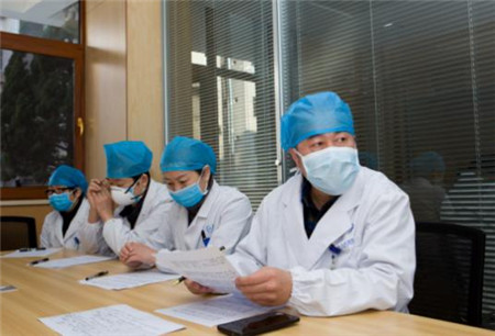 2月14日上午,在医院互联网医院办公区,感染性疾病科主任赵丽惠正在给杨玲、张波、简波、张英、刘英、东方湘云、段云庆、栗永胜8位中医专家介绍目前隔离病区内新冠肺炎患者的基本情况。