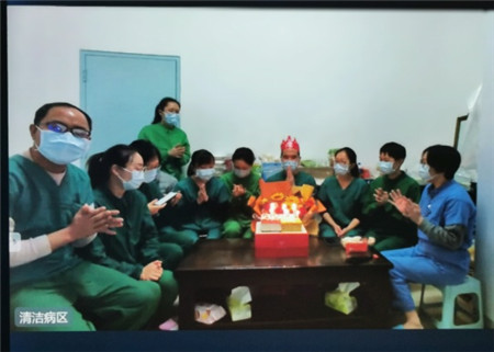 "祝你生日快乐,祝你生日快乐"。2月15日是隔离病区王福平医生的生日,院工会精心准备了生日蛋糕送进隔离病区,隔离病区内休息换岗的医护人员齐聚一起为王医生过生日。玉溪市人民医院党委副书记、工会主席杨玲,副院长、工会副主席张锡光,工会副主席李所贵代表医院党政领导班子及全院职工通过视频对话方式为王医生送上生日祝福,并殷切嘱咐王医生及隔离病区的医护人员在做好医疗工作的同时,注意个人防护 ,保重身体!