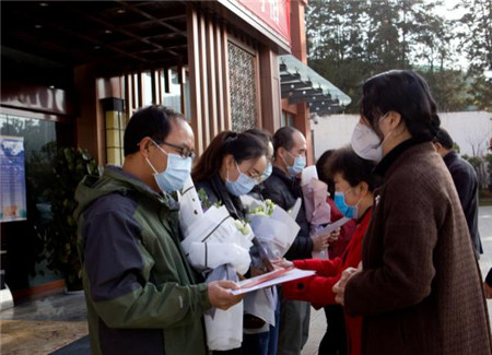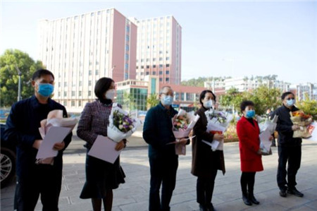 院领导恭喜7名医护解除隔离观察,迎接他们"回家",表达了对7名医护的关心和慰问,为他们送上鲜花、慰问信和红包。