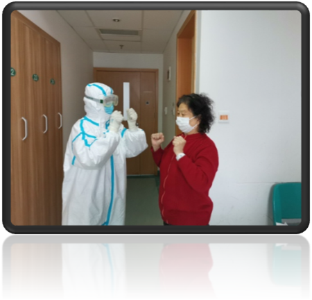 "好,吸气….呼气….抬脚"病房里经常传出这样的话语,原来是来自于玉溪市人民医院的张锡丽护士在病房里教大家做肺呼吸训练。75岁的婆婆虽然做的有点费力,但是仍然在努力坚持着,努力把每一个动作做到完美。这种与疾病在抗争的精神感染着我们每一个人。婆婆说:"我年纪大了,我想快快康复,虽然我有点费劲,但是因为有你们在,我看到了希望,希望就在前方,我也要加油!"。隔离病房里,这样温馨和睦的场景经常在发生,战"疫"正酣,曙光在前!婆婆加油!我们一起留下这一份生命中的美好!