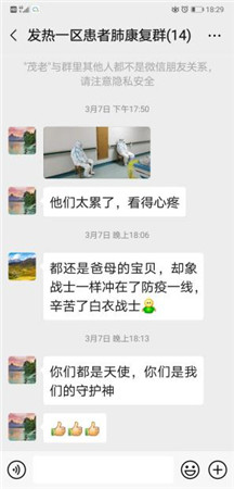 医护知道患者的痛苦,患者清楚了医护的艰辛。用心的患者用自己的双手拍下病房门口的同事照片,并在医患沟通群里写下:"都还是爸母的宝贝,却像战士一样冲在了防疫一线,辛苦了白衣战士""他们太累了,看得心疼""你们都是天使,你们是我们的守护神"。护士是陪伴患者走夜路的人,我们虽然不能改变夜的黑,但我们的陪伴可以增加患者走过夜路的黑,看到这些发自内心的感谢,我们的内心也是满满的温暖,病患对我们的褒奖和肯定,就是我们最大的动力,也是此次驰援武汉最大的收获。"!