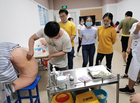 随着考试模式的变化,教学管理部在原有培训的基础上增加了6项护理操作:吸痰术、吸氧术、胃管置入、导尿术(男性、女性)、动、静脉穿刺采血。急救技能4项:开放性伤口的止血包扎、四肢骨折现场急救外固定、除颤仪使用、简易呼吸器的使用。其他技能4项:三腔二囊管置入术、手术区消毒、铺巾、清创缝合术、脓肿切开引流术。以上操作均邀请了医院院级培训教官进行现场培训,学员通过培训以后进行自主练习。同时针对心电图、影像知识及病史采集、病例分析也邀请了医院专科专家进行授课。