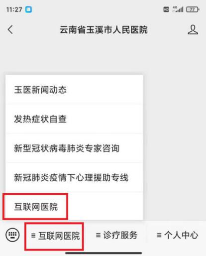 方法二:首先微信搜索“云南省玉溪市人民医院”官方微信并关注,然后进入官方微信对话界面,在左下角找到“互联网医院”,点击进入,用浏览器打开APP下载地址进行下载安装。