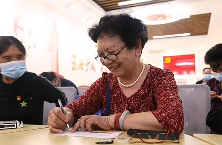 下午14:30,老党员们在活动正式开始前就来到现场,亲手裱花制作生日蛋糕。这样的形式对于支部老党员们来说,还是第一次,大家齐心协力,认真在蛋糕上画出红色的党徽,表达自己对建党100周年的激动感怀之情,共祝我们的党生日快乐。并在领取到的党员留言卡上写一句最想对党说的话,粘贴在党建心语墙上。