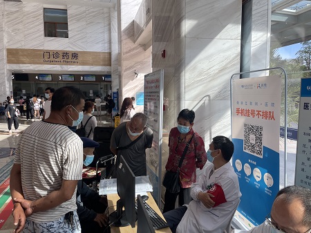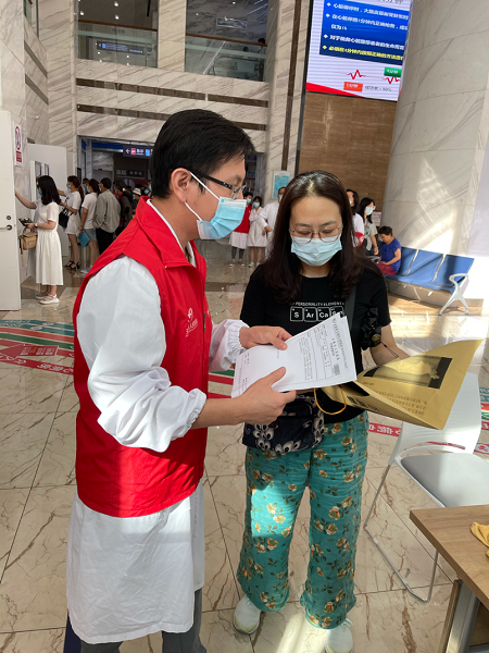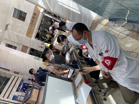 2021年6月3日,影像科党支部牵头开展“读片义诊活动”。早上,由医学影像部马坚主任,党支部书记邓志春、党支部副书记张靖三位专家坐诊,在医院新大楼一楼大厅开展“读片义诊活动”。