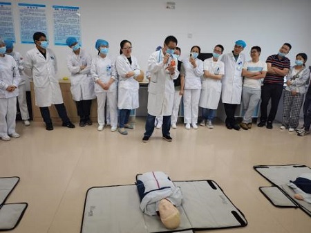 吕天虎对新冠疫苗接种医疗保障任务的重要性、艰巨性进行了强调,并对培训提出了要求。培训采用理论知识授课与现场操作演示训练的方式进行。急诊内科主任唐元旭、全科医疗科主任陈斌、重症医学科杨俊明副主任医师、急诊内科张颖主治医师分别从不同角度进行讲解并演示。