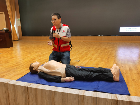 我院内科党总支书记陈斌应邀参加活动,并开展进急救知识的培训宣讲,陈斌主任跟大家分享心肺复苏、除颤仪和海姆立克急救法的操作要点,在如何呼救、如何口对口呼吸、如何按压、如何电击等关键步骤处加入诙谐风趣的语言,一边讲解一边示范,使急救技能通俗易通,深入人心,得到参会人员的一致肯定。