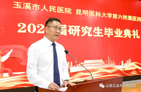 玉溪市人民医院党委书记范永光在典礼上致辞,7月1日是建党节,2021年更是中国共产党成立100周年,在这个特殊的历史位点,同学们顺利毕业,即将走向广博的人生舞台,既要学有所成,又要大有可为,既生逢其时,更应重任在肩。期望同学们,继续弘扬党的优秀历史文化传统,发扬艰苦奋斗、刻苦拼搏的良好品质,躬耕实践,全身心、全方位真诚地投入到未来的工作岗位上,做一个对社会有用的人。