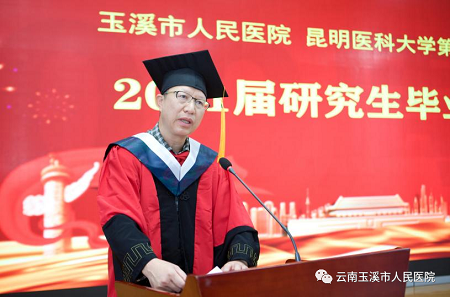 院党委副书记 院长曾勇教授、党委书记范永光,医院全体院领导、博硕士研究生导师,玉溪市第二人民医院院长蔡德芳教授、2021届硕士毕业生及在校生代表150余人参加典礼。典礼由玉溪市人民医院科研管理部主任滕兆伟主持。
