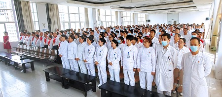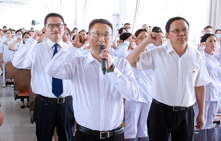 6月30日,“中共玉溪市人民医院委员会庆祝中国共产党成立100周年新党员入党宣誓暨‘两优一先’表彰大会”召开。院属党委委员、县处级非党领导干部、纪委委员、新接收的预备党员、“光荣在党50年”老党员代表、受院党委表彰的优秀共产党员、优秀党务工作者、先进基层党组织代表,各党总支(党支部)书记、副书记、支委,全院各科室主任、副主任、护士长、副护士长、工会主席及副主席、团委书记及副书记,离退休党员代表,在职在岗的全体共产党员共计500余人参加了会议。党委副书记、院长曾勇主持会议。
