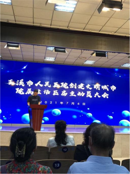 为进一步深化全国文明城市创建活动,提高市民文明素质,让做文明人,建设文明城市的意识广泛深入人心,营造全城动员,人人参与的浓厚氛围。2021年7月6日晚,玉溪市人民医院结合本院实际情况及时召开“创文创卫生活区住户公约”动员大会,离退休党总支书记师丽君首先作了动员讲话。玉溪市人民医院副院长赵云焰、红塔区聂耳社区领导参加了会议。