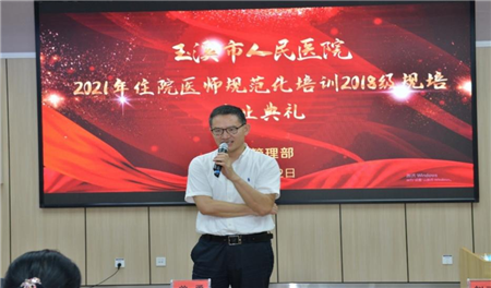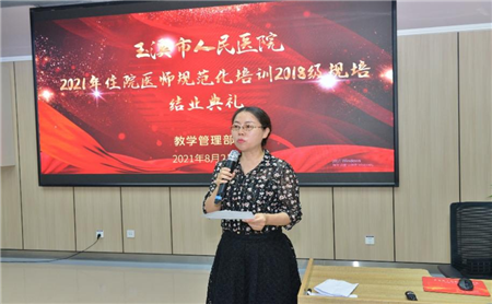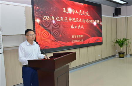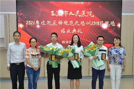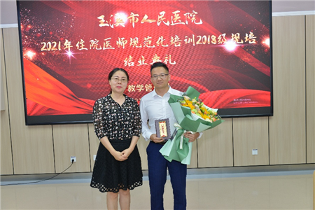 典礼上,曾勇院长代表医院班子和全院教师向学员们表达了祝贺,希望各位学员不忘初心,坚持全心全意为患者服务的思想,脚踏实地、不断积累、不断学习,成为国家、社会需要的优秀医务工作者。接着,赵云焰副院长宣读医院对2021年度优秀学员的表彰决定,参会院领导、教学基地负责人、教学主任为优秀学员4人颁发了鲜花和荣誉证书。