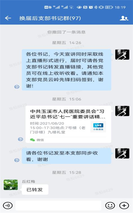 由于本次宣讲处于疫情防控重要时期,医院又是疫情防控的重要地点,为使广大党员均能很好的参与学习和听讲,宣讲采取线上和线下的形式进行,线下严格执行疫情防控措施,控制参与人数,参会人员扫码,量体温,间隔距离就座;线上宣讲采用现场直播的方式进行,直播链接发布在医院党支部书记微信群,由支部书记转发支部党员收听收看,确保全体党员都能参与学习和听讲。宣讲大会取得良好的效果。
