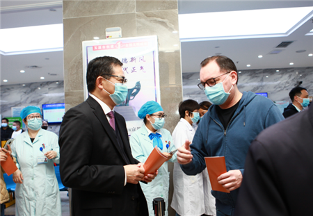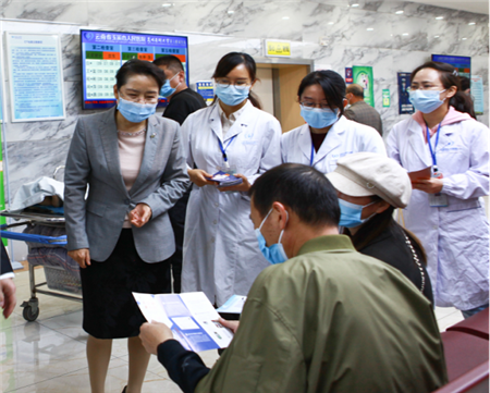 与会的领导现场给患者发放医疗收费电子票据宣传单,推广宣传医疗收费电子票据使用。