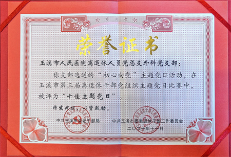 11月19日,由玉溪市委老干部局、市委离退休干部工委主办的“点赞百年辉煌·助力玉溪之变”为主题的“玉溪市最美银发志愿服务典型、五星老干部表扬大会”在市委党校召开。大会对在2021年中,全市的离退休党员组成的党支部党建方面有特色的优秀支部活动及老党员志愿者、五星老干部进行了表扬。我院离退休党总支外科支部党建活动“初心向党”主题党日获评“十佳主题党日”,老党员张学勤获评“健康之星”。