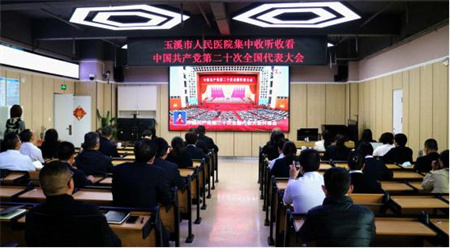 10月16日上午10:00,中国共产党第二十次全国代表大会在北京人民大会堂隆重开幕。玉溪市人民医院在保障正常诊疗服务的前提下,采取集中与分散相结合的方式,在医院会议室、示教室、住院病房等区域播放开幕会直播,组织收听收看党的二十大开幕会实况直播。