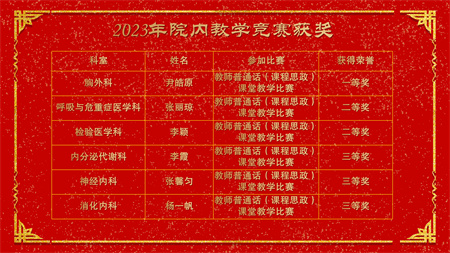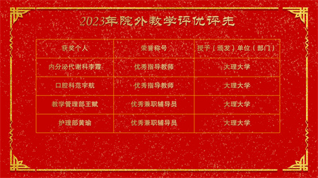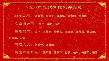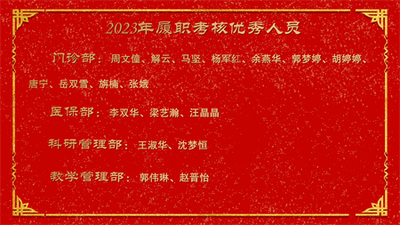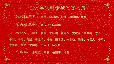 各副院级领导、保留原职级待遇领导分别安排2024年重点工作,副院长赵云焰安排部署春节前及春节期间安全生产工作,党委副书记杨玲、副院长吕天虎、副院长周云波、副院长张靖、保留原职级待遇领导朱红媛分别对2023年度履职考核优秀人员、2023年度杰出医护技人员、从事医疗事业三十年职工、2023年护理竞赛获奖人员、昆医和大理大学教学竞赛获奖、评优评先、院内教学竞赛获奖人员及2023年优秀科室运营助理员及运营管理先进科主任进行了通报表扬。