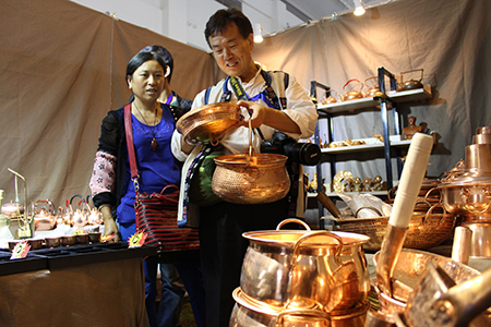作为参展商之一的陶文龙祖上便开始打铜,到现在已是第4代了。他说:“我们今年带来的商品有100件左右,主要是铜壶和铜锅,其中也包括了一些铜制的工艺品。粗略估算一下,仅开幕当天我们的铜器就吸引了百余位客商前来询问,他们都对江川铜器很感兴趣。我们的产品工艺好,就拿铜壶来说,是使用传统工艺整体打制而成,并经过上百道工序的打磨才来到南博会,具有较高的使用性和观赏性。与其说人们喜欢我们的铜器,不如说是喜欢我们的工艺。”