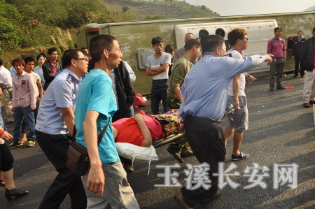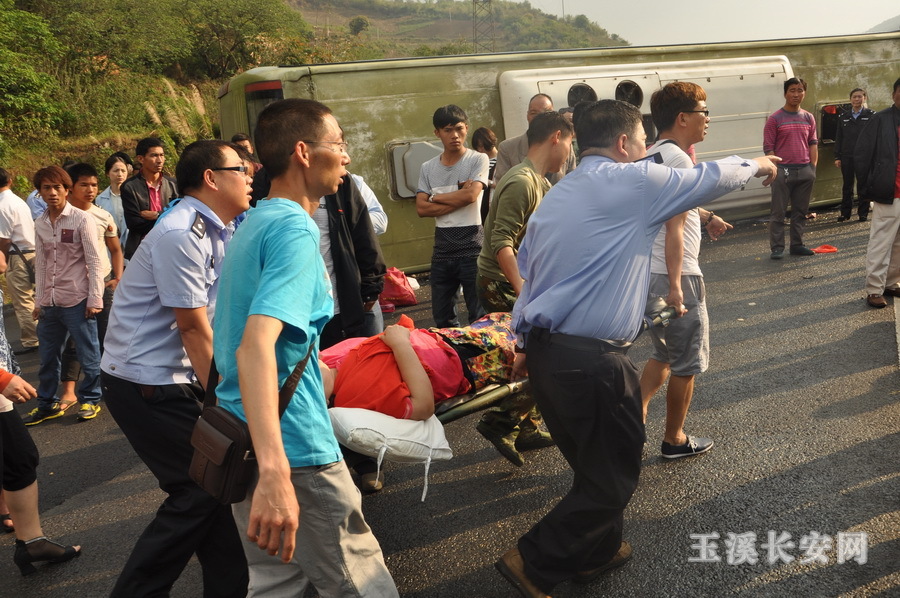 2015年4月8日15时57分,新平县公安局110指挥中心接报称:在昆磨高速公路上行线扬武立交附近,一辆旅游客车侧翻在路中间,车上人员具体情况暂不清楚,请公安机关赶快出警处理。接到报警后,指挥中心立即指令市高速公路交巡警大队新平中队赶往现场处置。
