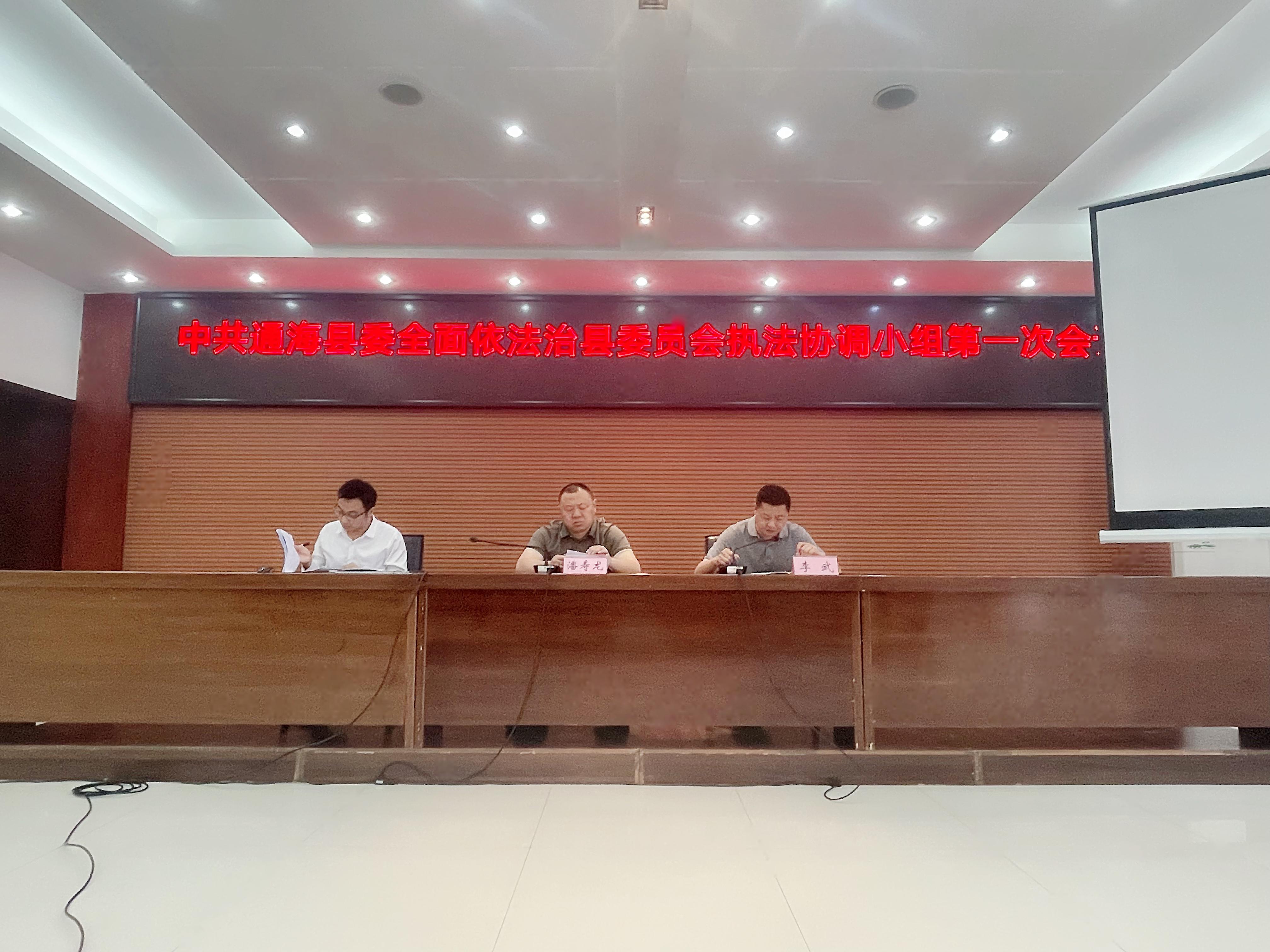 4月25日,中共通海县委全面依法治县委员会执法协调小组第一次会议召开。县委全面依法治县委员会执法协调小组组长、副县长、县公安局局长潘寿龙,执法协调小组各成员单位主要负责人参加会议。会议邀请县委政法委常务副书记罗本勇、县人民检察院副检察长罗朝明就行政执法与刑事司法衔接进行授课。