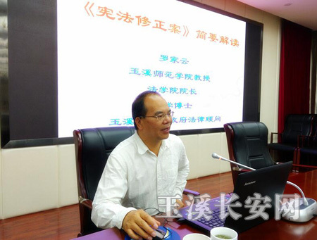 依据《玉溪市政府办公室开展2018年宪法学习宣传教育活动方案》,7月17日上午,市政府办公室举办了宪法宣讲活动,活动邀请玉溪师范学院法学院院长罗家云教授进行了《宪法修正案》讲解。罗教授从我国宪法的历次修改、历次宪法修改的主要内容、我国宪法修改的基本特点和经验和宪法第五次修改的基本内容等4个方面进行了讲解,罗教授的宪法宣讲理论联系实际,深入浅出,让参加宣讲活动的工作人员对宪法有了一个全新的认识,增强了宪法意识和观念。