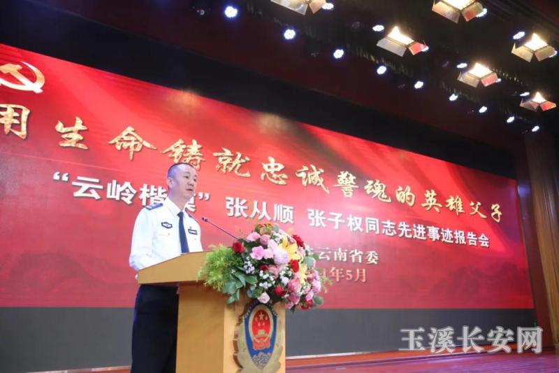 5月18日,由省政法队伍教育整顿领导小组、省委宣传部、省委政法委、省公安厅组织的“云岭楷模”张从顺、张子权同志先进事迹报告会在玉溪举行,以英烈父子的先进事迹教育引导我市民警牢记使命担当、忠诚履职,为建设更高水平的平安玉溪贡献智慧力量。
