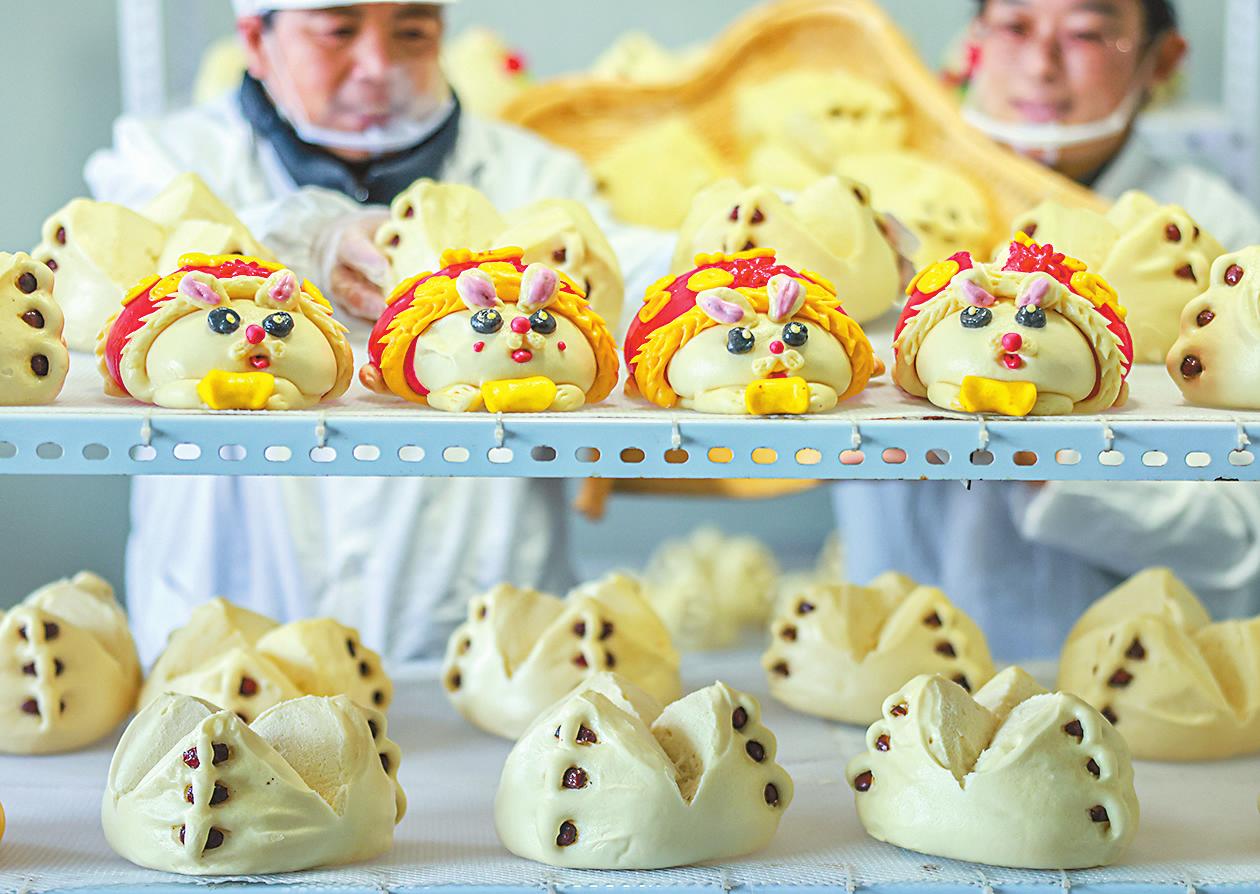 1月11日,在荣成市崖头街道荣安社区一处花饽饽制作坊,工作人员在摆放蒸制好的“兔头”花饽饽和枣饽饽。兔年春节临近,山东省荣成市传统花饽饽进入制作和销售旺季。胶东花饽饽是胶东地区过年常用的面点。近年来,当地政府通过组织“线上直播培训、线下大赛展销”等模式,利用电商渠道拓宽销路,让老手艺“蒸出”致富路。
