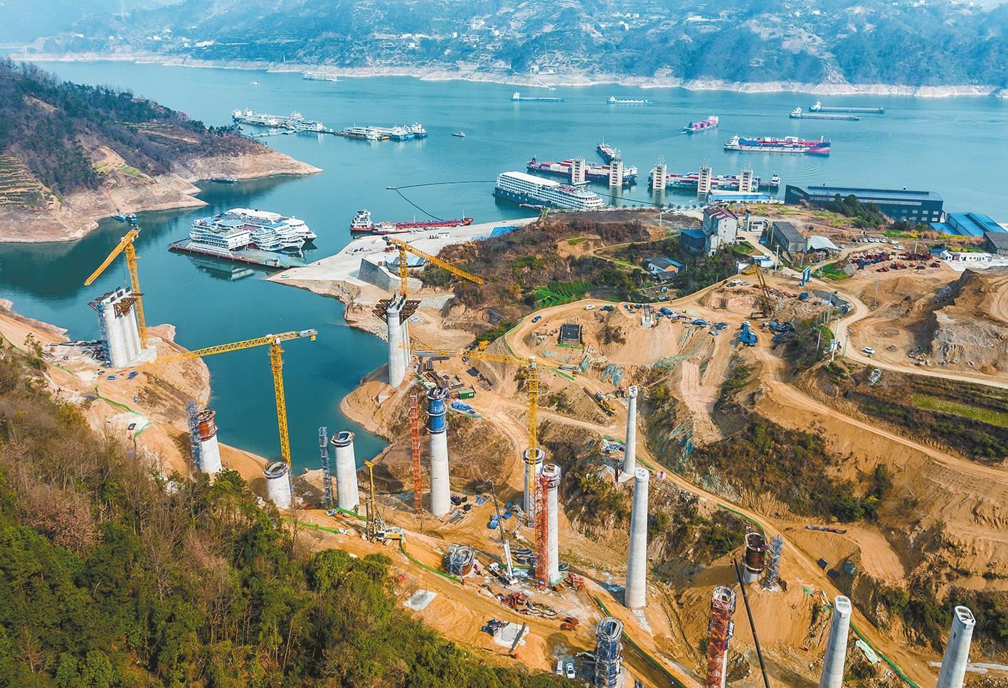 2月20日,工人在三峡库区湖北省宜昌市秭归县三峡枢纽茅坪港疏港铁路建设工地施工(无人机照片)。