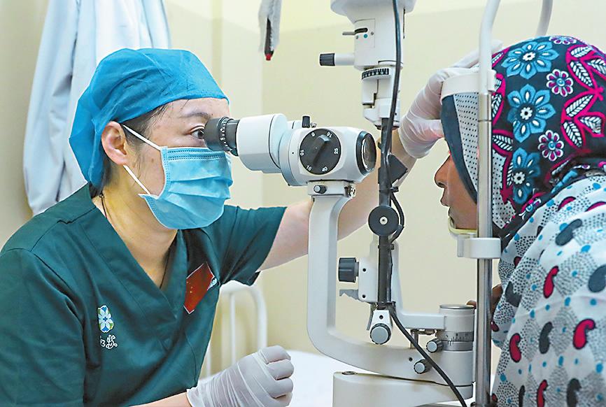 2月23日,在坦桑尼亚桑给巴尔岛纳兹莫加医院,董莉莉(左)为穆欣进行术前检查。来自中国江苏省泰州市人民医院的董莉莉是第32期中国援桑给巴尔医疗队的眼科医生,目前在纳兹莫加医院从事眼科诊疗及带教工作。46岁的白内障患者穆欣左眼不能视物已三年,被诊断为早老性白内障。经过董莉莉白内障手术后的第一天,穆欣左眼视力达到0.3。从去年十月开始工作至今,董莉莉已实施297例白内障手术,为患者带来了光明。