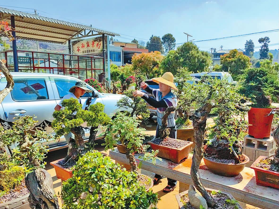 3月25日,在通海县里山乡五山村盆景交易市场,种植户正在修剪盆景。作为“省级盆景村”,五山村每逢周六就赶盆景街,40多家盆景种植户搬来数百盆盆景展示售卖,吸引了各地的消费者前来观看、购买。本报记者 白诚颖 摄