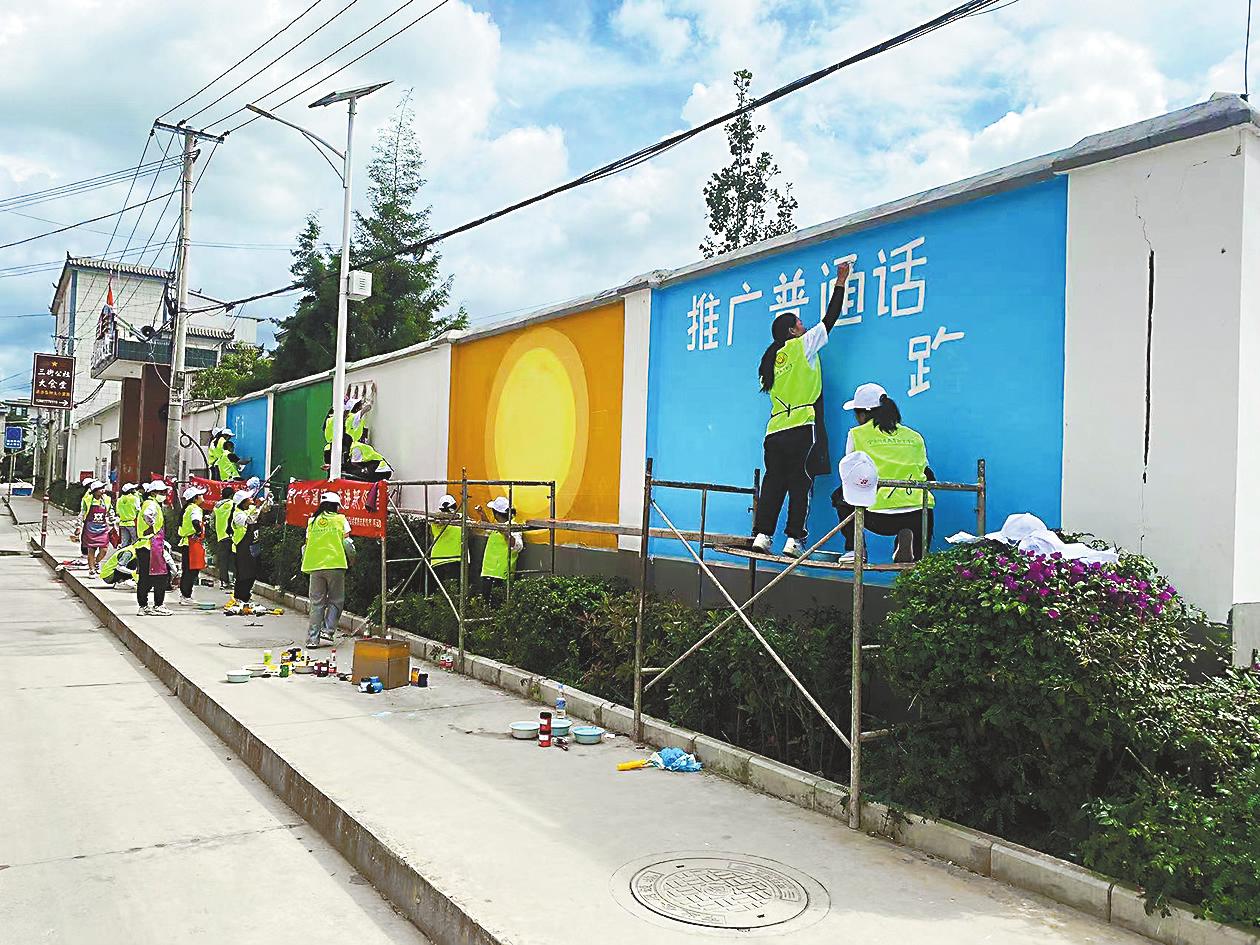 7月8日,在江川区开展的2023年暑期“强国复兴有我 文明实践同行”暑期新时代文明实践志愿服务活动中,来自云南特殊教育职业学院艺术系的听障学生利用自己的专业技能,在江川区星云街道三街社区绘制墙画,提升乡村文化品位及群众人文素养,助力乡村振兴。 本报记者 陈苏欣 摄